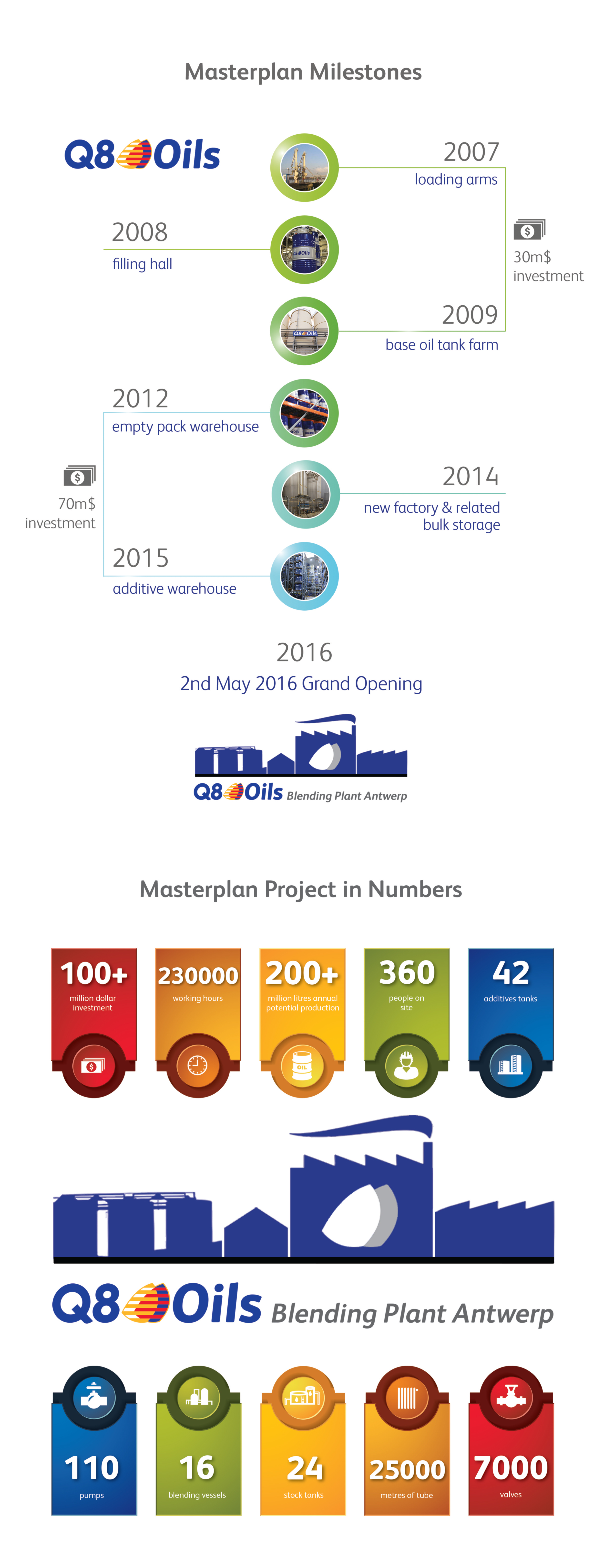 Om de ambitieuze groeiplannen van Q8Oils in Europa en de rest van de wereld te helpen verwezenlijken, stelde het bedrijf een masterplan voor de renovatie van de Antwerpse menginstallatie op. In de eerste fase (van 2007 tot 2009) werden de laadarmen, de vulhal en het tankpark voor basisolie gerenoveerd, goed voor een investering van 30 miljoen dollar. Van 2012 tot 2015 investeerde Q8Oils nog eens 70 miljoen dollar in de bouw van een pakhuis voor lege verpakkingen, een nieuwe blendinginstallatie met bijbehorende bulkopslag en een nieuw magazijn voor de opslag van additieven.